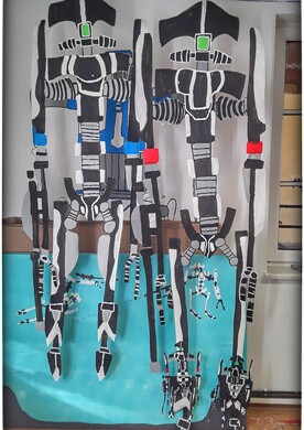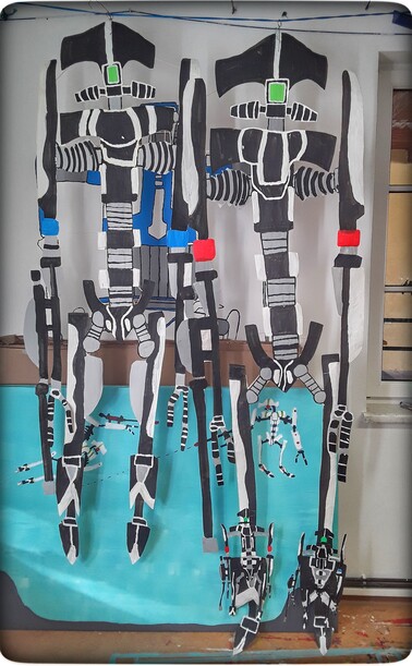 Aquadroidenpaar „Edelweiß“, Acryl und Filzmarker auf Papier, mit Holzverstrebungen und Klebeband, 2023