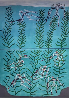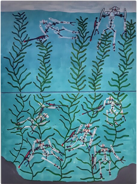 „Aquadroiden unter Wasser“, Acryl und Filzmarker auf Leinwand, 2023