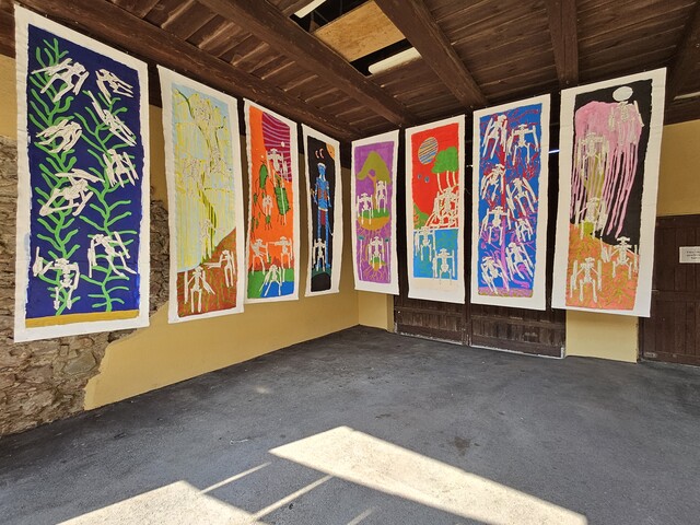 08.09.2023, Präsentation der Installation „Figuren an der Frischluft“, Acryl und Filzmarker auf Papier, mit Holzverstrebungen und Klebeband