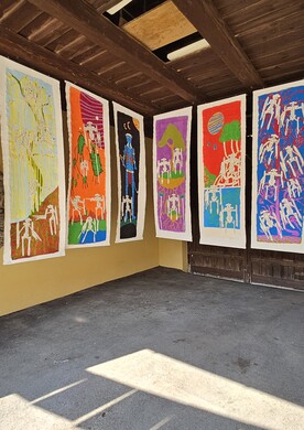 20-teilige Bilderserie „Gebetsfahnen“, 2025, Acryl und Filzmarker auf Stoff