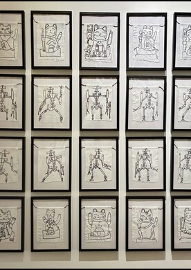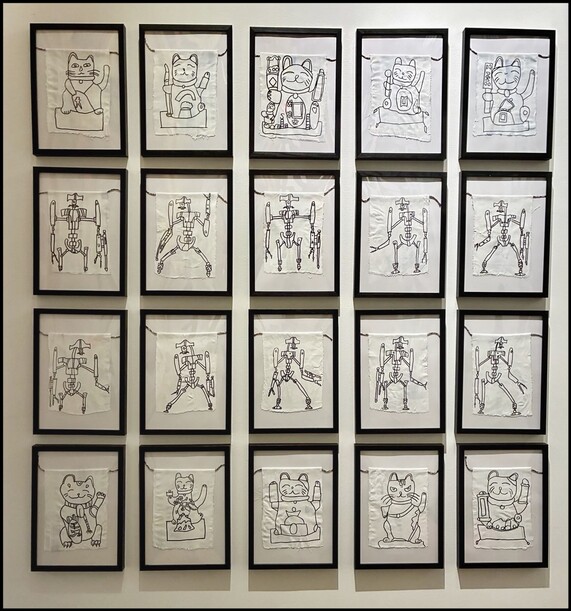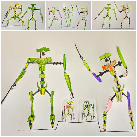 Temporäre Assemblage, Aquadroiden, 2025, Acryl, Filzmarker und Farbstift auf Papier